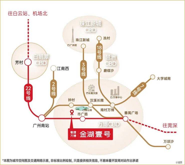 核心优势:项目距地铁22号线市广路站约800米,步行约10分钟可达,1站番禺广场、2站万博中心、3站琶洲CBD、4站珠江新城;配建12班幼儿园,东侧地块规划36班九年一贯制学校;周边有约43万㎡祈福缤纷世界、超2万㎡宜家家居等大型商业;紧邻约1630亩金山湖文化公园,直线距离仅约400米,享一线湖景资源。项目由六大设计团队联袂打造,配备约2700㎡高定会所(含恒温泳池、健身房、瑜伽房等)和约1.3万㎡中央大花园。
