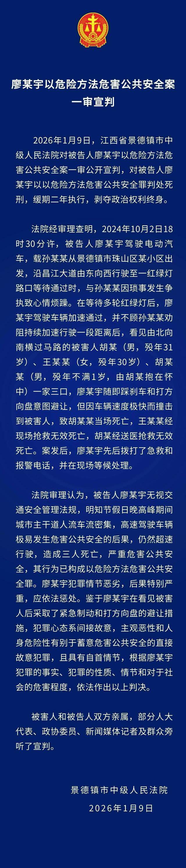 1月9日,江西省景德镇市中级人民法院对被告人廖某宇以危险方法危害公共安全案一审公开宣判,对被告人廖某宇以以危险方法危害公共安全罪判处死刑,缓期二年执行,剥夺政治权利终身。