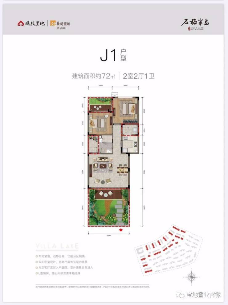J1户型,建筑面积约72平米,两房一卫(平层),前后有花园,折后总价约180万