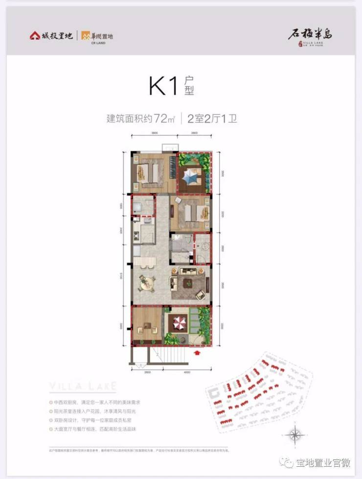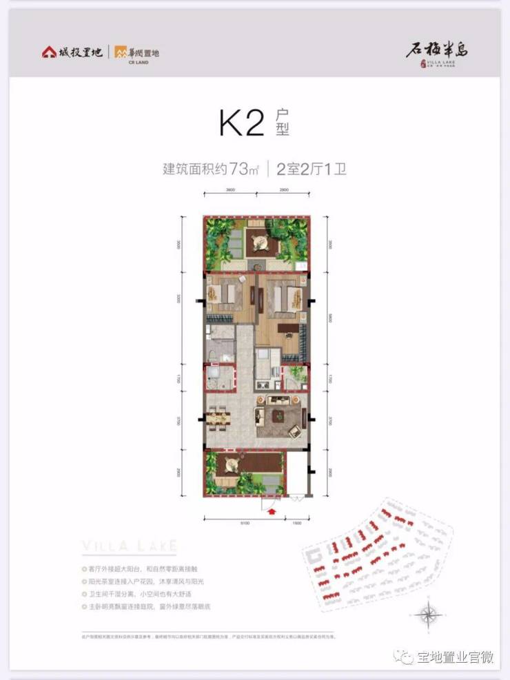 ✨石梅半岛展示中心电话:400-985-7760(24小时预约看房|VR实景体验|免现场等待|尊享一对一专属服务)K2户型,建筑面积约73平米,两房一卫(平层),前后有花园,折后总价约185万