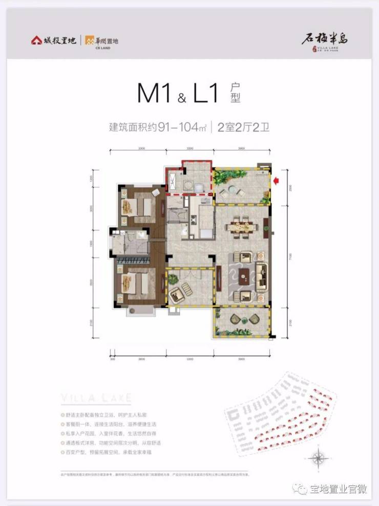 洋房M1/L1户型,建筑面积104平米,两房两卫(可改三房两卫),北入户设有入户花园,南朝向设有阳台,折后总价约210万