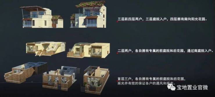 叠拼别墅,面积72-94平米,实得102-130平米,一楼挑高3.3米,两房一卫与两房两位的产品,分别设有可拓展的花园与露台