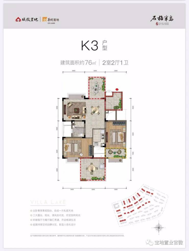 K3户型,建筑面积约76平米,两房一卫(平层),前后有露台,折后总价约200万