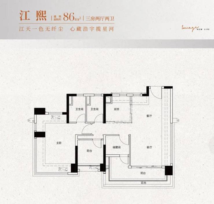 ②建面约120㎡:四房两厅两卫设计,共有2个户型可选,四开间朝南,居住与生活动静分离,南向大阳台或南北双阳台,主卧带270°飘窗