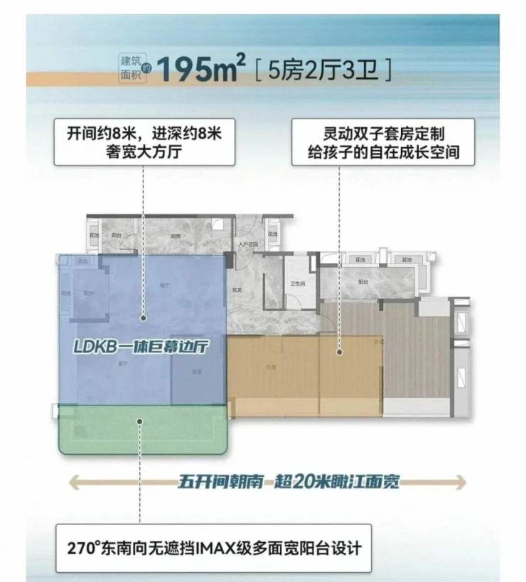 五开间朝南 | 超 20m 瞰江面 | 64㎡巨幕边厅 | 灵动双子套房