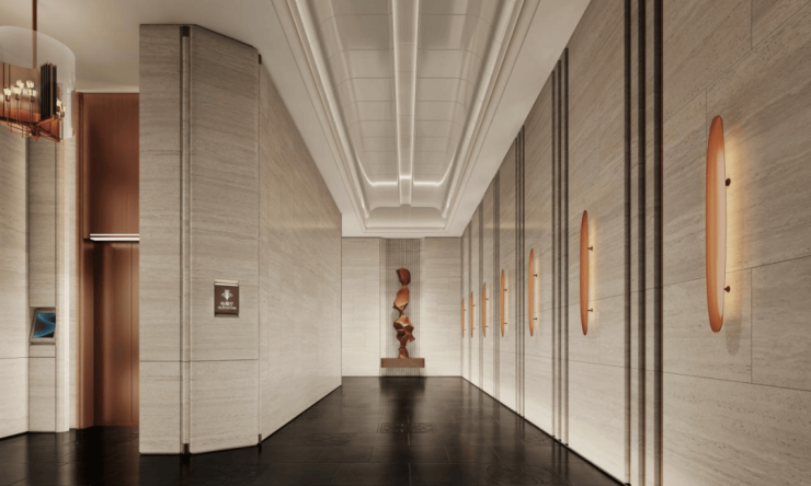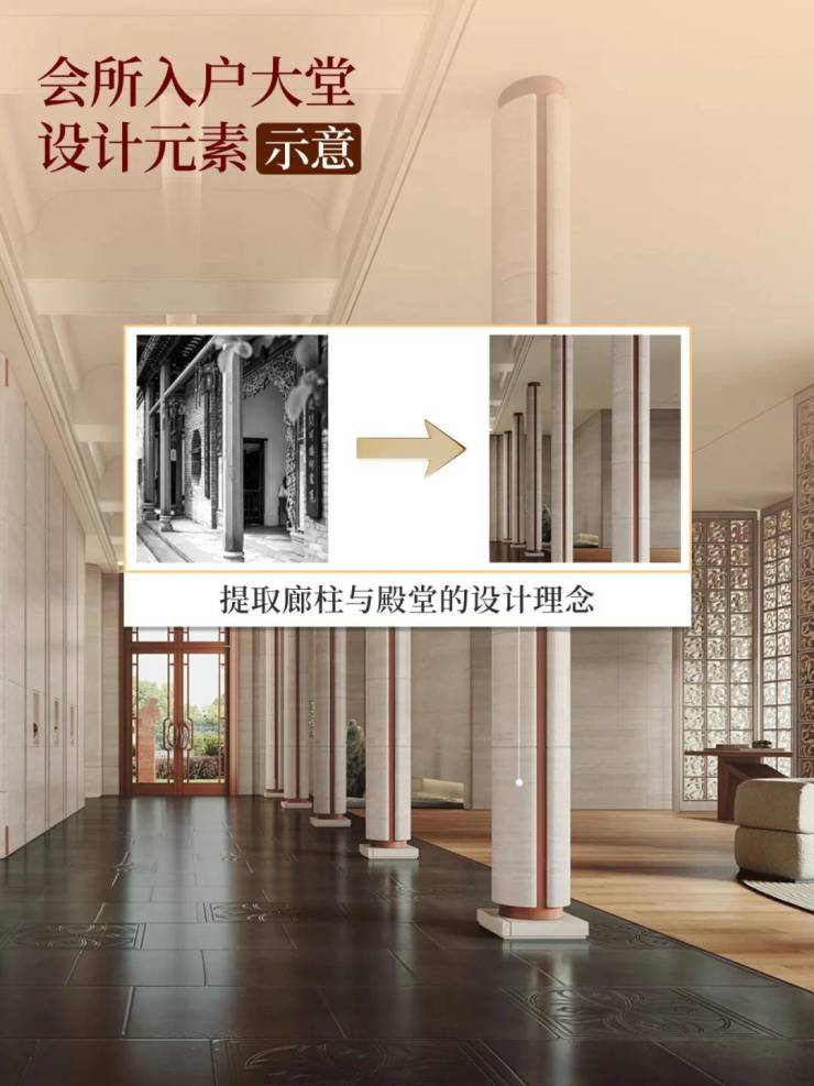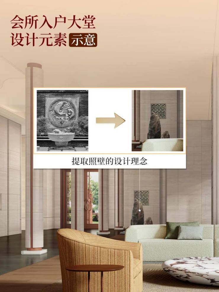一层入户大堂整体艺术风格以岭南古典庭院艺术中“照壁借景”和汉文制式的“云气纹”为设计线索,饱含人文气息的东方叙事,打造当代的都会桃源。