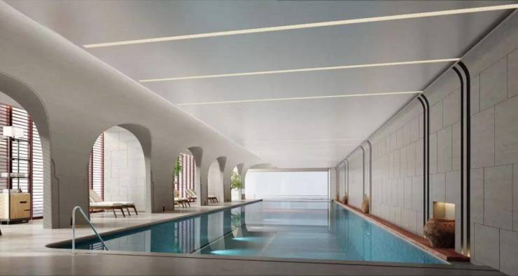 进入会所,最引人注目的,莫过于50米的江幕无边际泳池,泳池打造南法风的异域风情,充满度假的浪漫与写意。