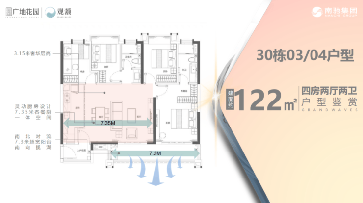 改善家庭可以看 122㎡四房,南北对流的格局让穿堂风很舒服