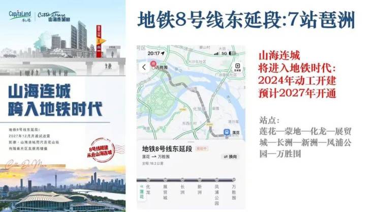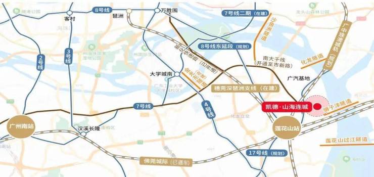 地铁交通:距离项目2.5公里处有莲花山站,佛莞肇城际已经开通运营了,3 站到长隆万博,4 站到广州南站。另外佛莞深城轨琶洲支线还在建设中,(2 站到大学城,3 站到琶洲)以及广中珠澳城轨(规划中)和8号线地铁的东延段(预计2027年通车)。