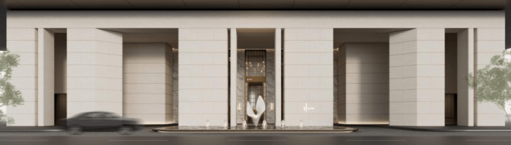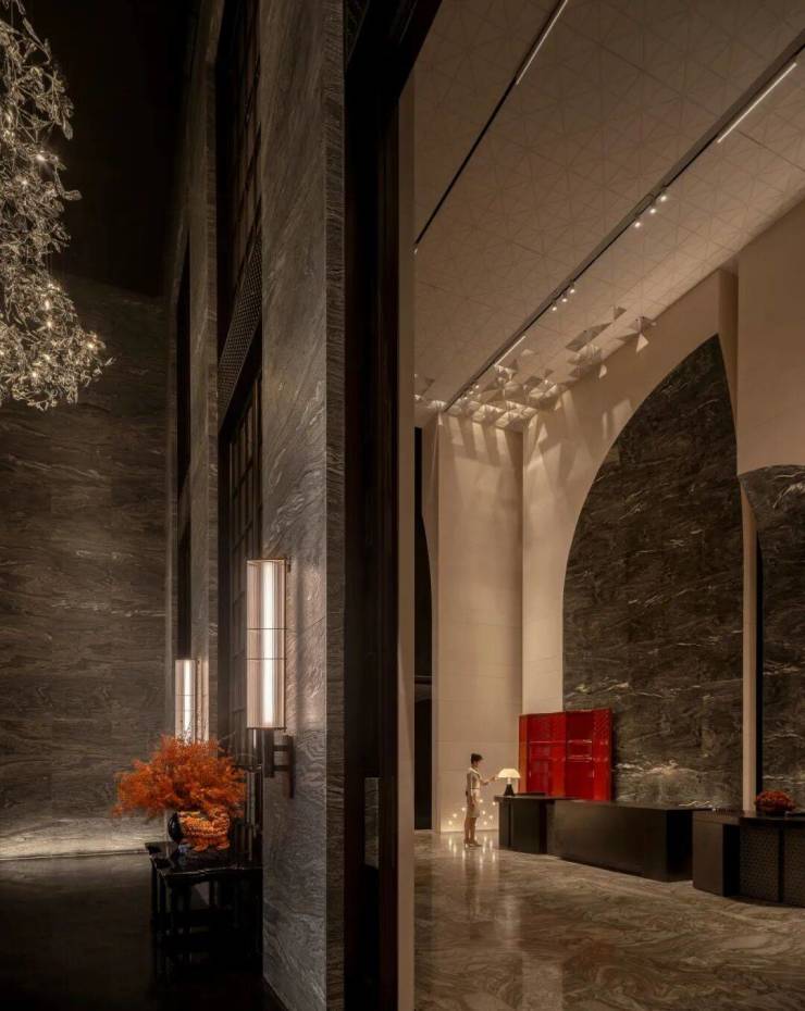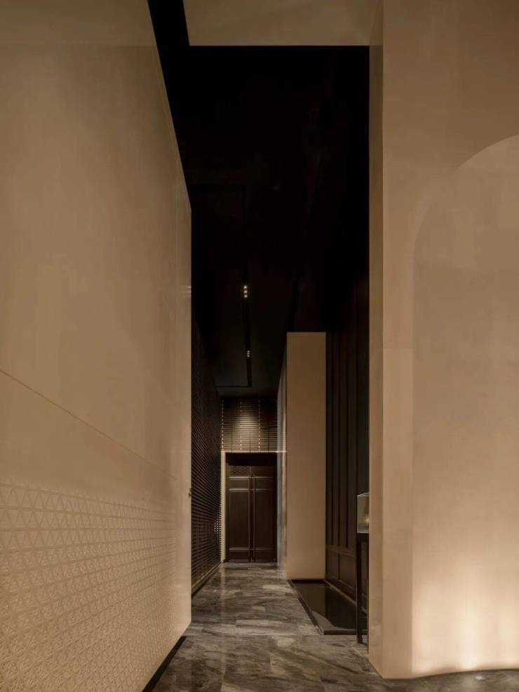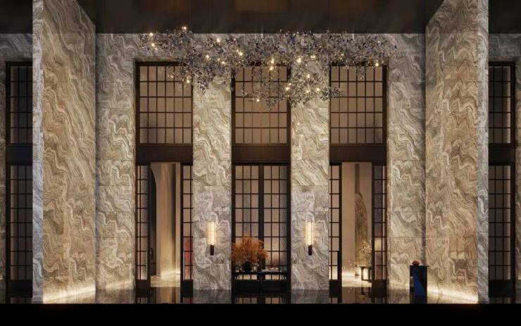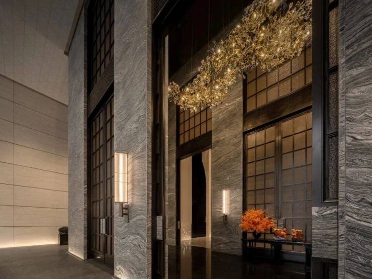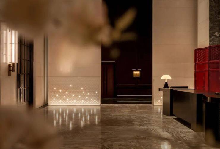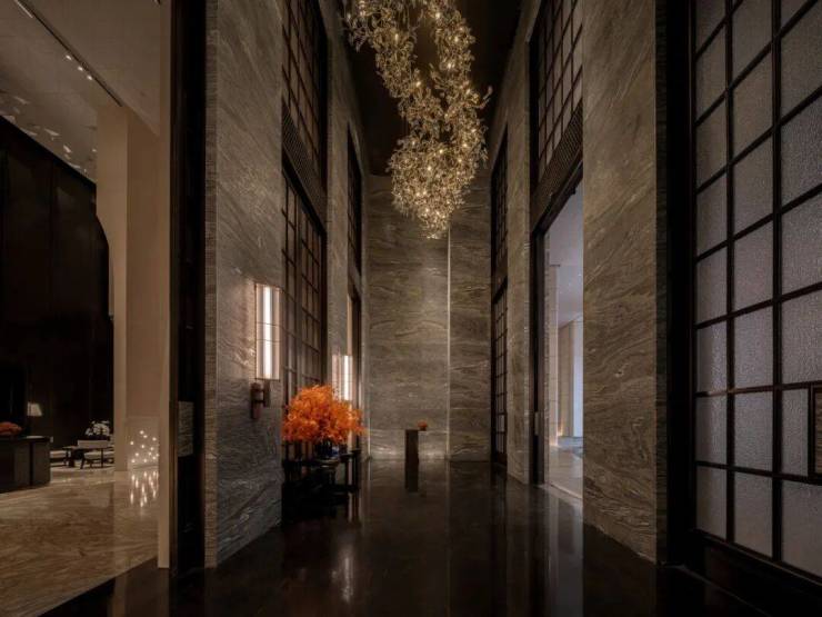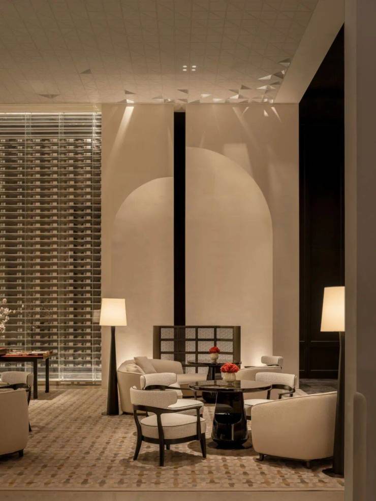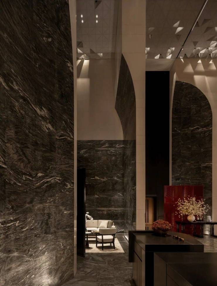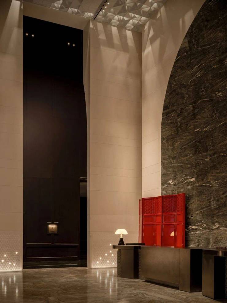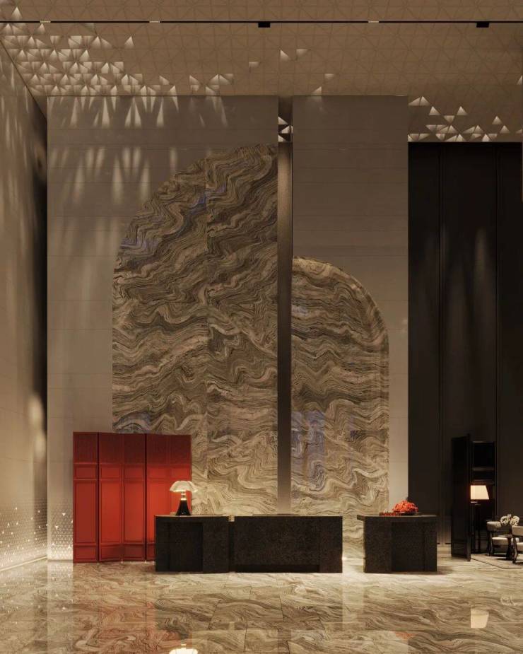 电梯厅内,天然石材经由简练的几何构成,奠定了空间纯粹且富于现代感的基调。局部光影与艺术陈设作为点睛之笔,让这份简约在不经意间流露出细腻的层次。这些墙面装饰,均由石材经深浅不一的浅浮雕制成,在近人尺度观看时犹显奢华姿态。