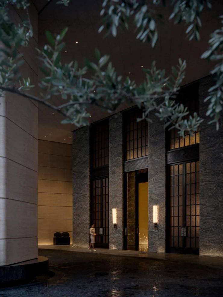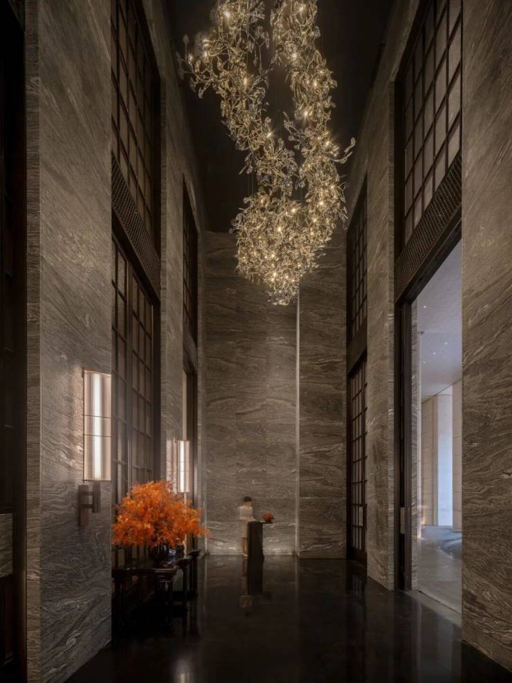 富有流动感的“水云纱”石材与通高的落地金属格子玻璃长窗玻璃勾勒出二、三进立面的对称格局。门边两侧各缀一盏暖色壁灯,门前摆放着一捧怒放的大红色鲜花,这些细碎的温暖,正是归家时最动人的仪式感。