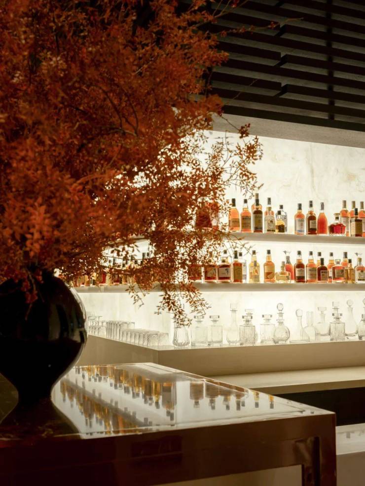 从帆樯的意象演化而成的墙面内扩弧形让整个洽谈区包裹感更强;在暖黄的灯光下,向上延伸的米色石材搭配深色的木饰面,在有限的空间中营造出高耸又悠远的氛围。