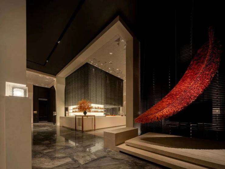 深入室内更核心的区域,洽谈功能区由多道浅色窄墙围合而成。设计上以 “帆樯林立” 为空间核心意象,在现代简约的基调中,低调却显张力的朱红色结合传统木雕点缀空间。最终呈现的空间既保持明朗精致的质感,又具备高端酒店的奢华属性,精准匹配业主接待与商务洽谈的核心需求。