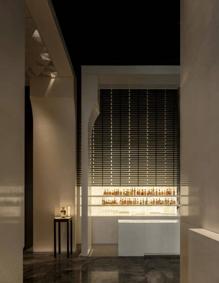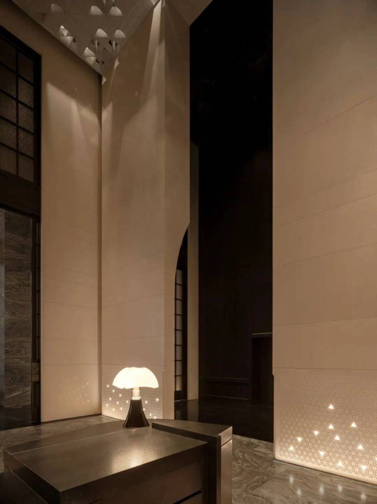 灯光穿过特殊构建的吊顶,配合墙面镶嵌的发光点,如落日在云间洒下的点点金斑,于纯净中蕴藏丰盈细腻的情感。