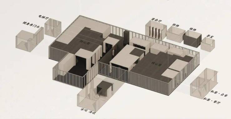 各功能区域作为浅色立方体,错落置于深色背景中,以此界定彼此。它们形成了既分隔又关联的微妙关系,这种布局带来的通透感与围合感交替出现,构成了空间内在的韵律。