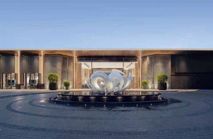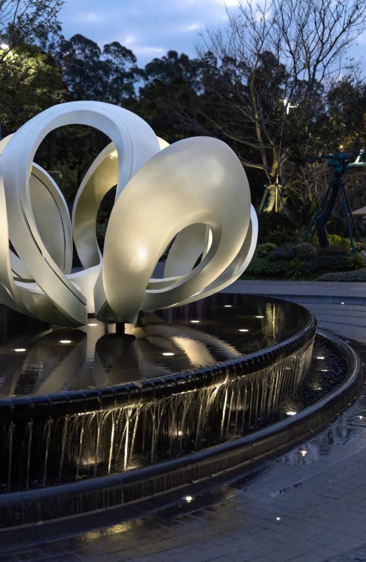 主入口处,用环形道路围合出主要空间,以花瓣形态雕塑为主景,温柔的传递着自然界的温暖与生生不息的力量,瞬间引人入胜。前庭区域作为展示的门面,左右两侧开放布局,巧妙地将城市街巷的活力引入其中,既汇聚了人气,也激发更多互动与交流的场景发生。