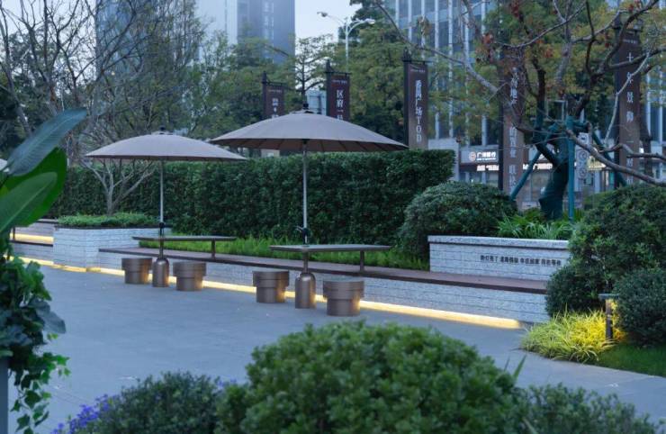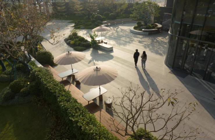项目在保留现场大树的基础上,采用中心聚向型的空间设计手法,结合舒适的户外软装设施,共同营造一个绿意包裹下的街角都市聚场。大树下的街坊空间结合线型软装外摆,实现人工与自然的结合,这是都市中一处舒适宜人的花园街区。