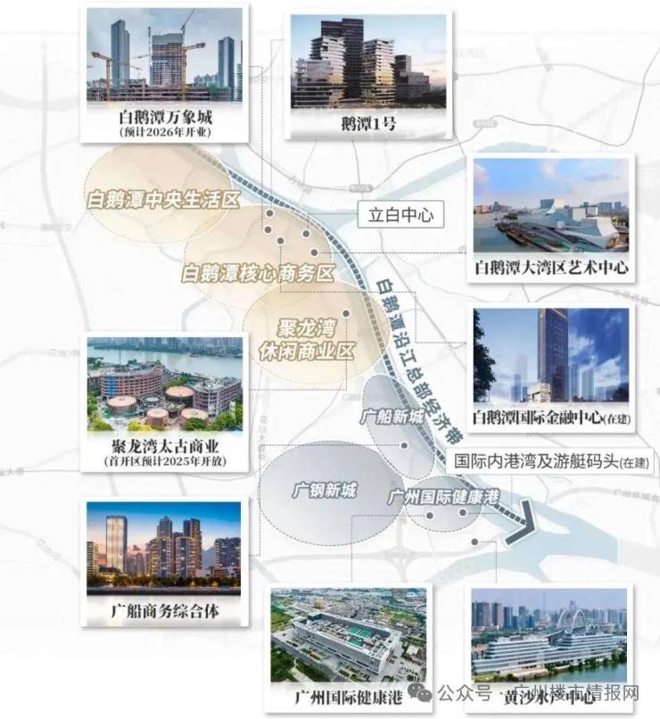 作为西翼CBD,则以重奢为支点、以沿江带为依托,开辟了一条带状连片、向外辐射的发展路径。白鹅潭不但产业猛进,各个维度的兑现相当“勤奋”。从搞商业、促旧改到建枢纽与修路桥,整个板块总让人常看常新。