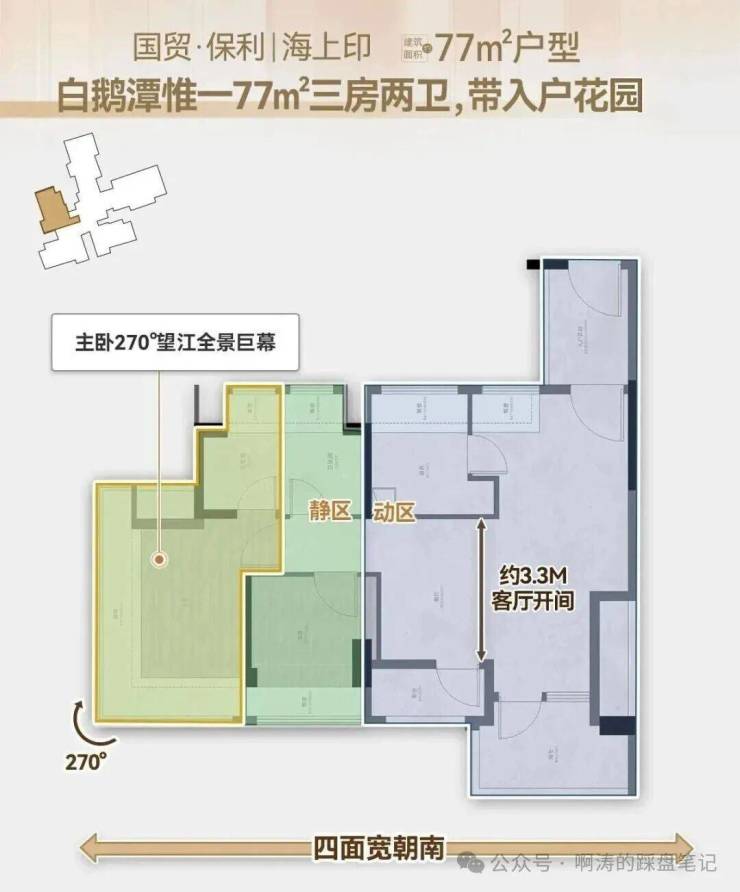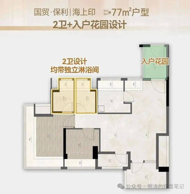 77㎡ 3房2卫: 片区唯一的80平内带入户花园+2卫的设计!