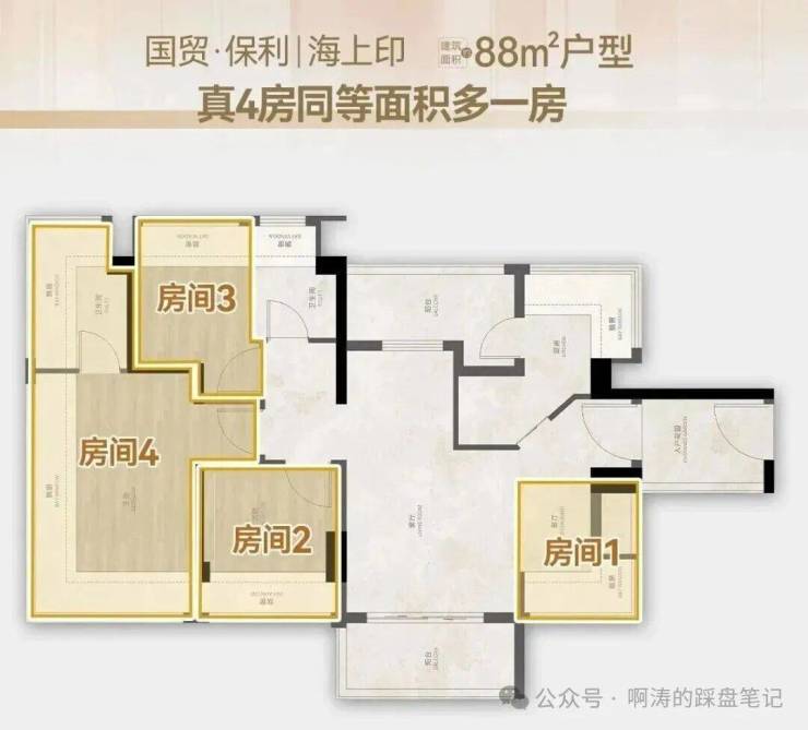 88㎡ 4房2卫: 把四房门槛卷到了90平以内,还是南北对流的单边位!