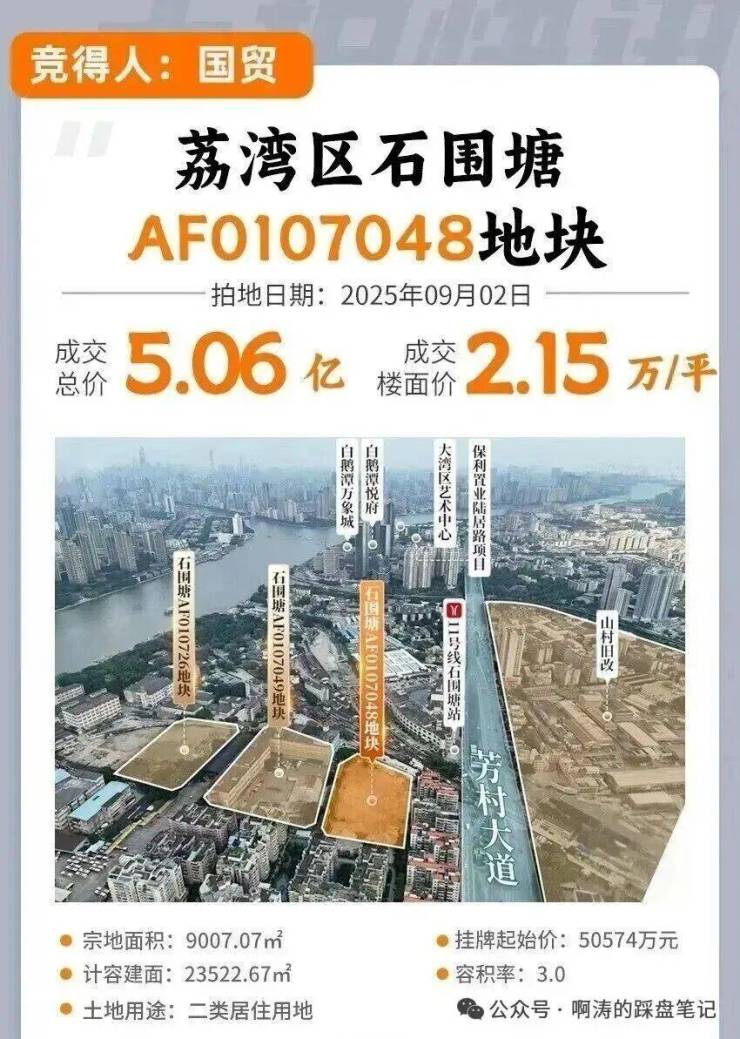 2025年9月2日,位于荔湾区石围塘地铁站旁的一宗宅地成功出让。