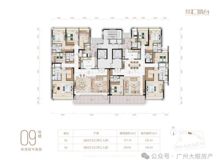 项目由14栋12层小高层组成,产品涵盖123-352㎡三至五房,共8类户型,户型实用率约82-84%