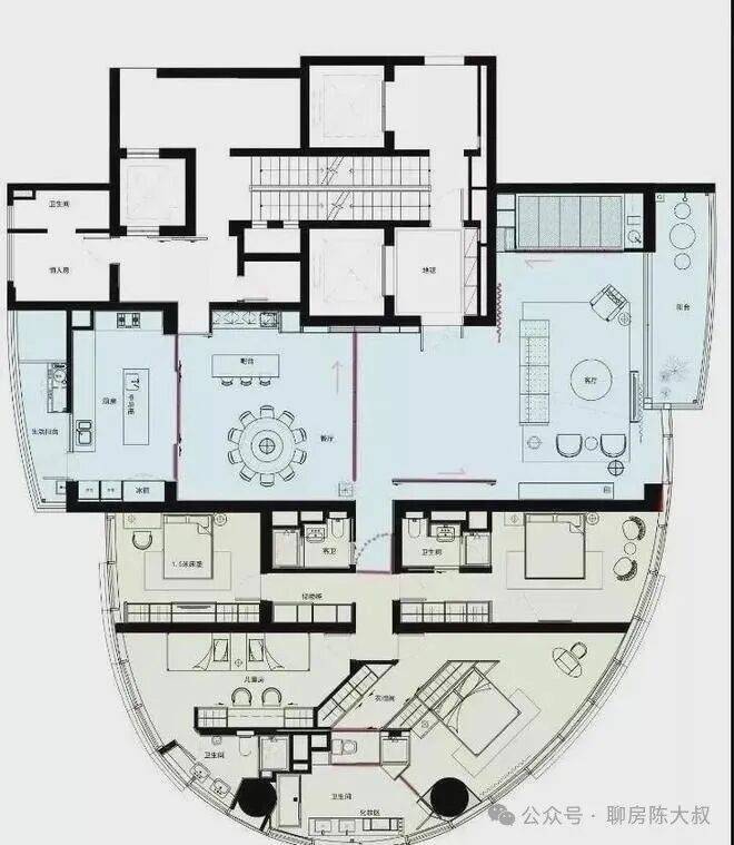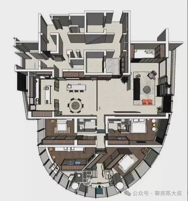 因为建筑本身结构关系。在空间布局上,我们更多的考虑到公共区域,主卧室及小孩房的布局