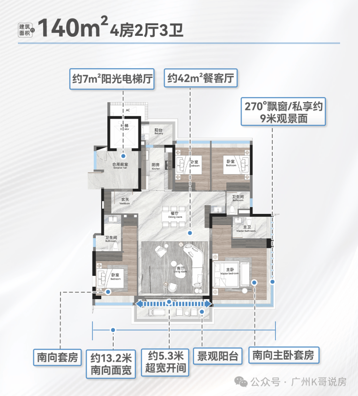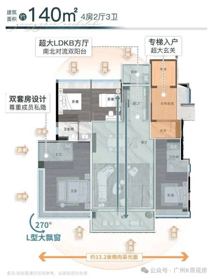 3、窗地比高达38%,主卧设置270°大飘窗。