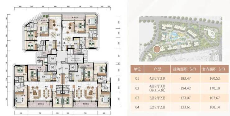 5#为3梯4户,主要分布的户型为123-194平的三至四房单位。