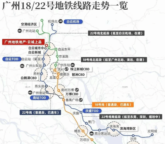 项目位于白云区嘉禾望岗板块,地处白云几何中心位置,是白云区“五片协同”发展格局中,白云城市中心轨道站点TOD综合开发的核心区域。根据白云区“十四五”规划,该板块将聚焦轨道站点周边开发,打造集商务服务、行政公共服务、文旅休闲于一体的现代功能智慧城心,板块发展潜力逐步释放。交通层面,项目为在建地铁18号线与22号线交汇的白云城市中心站上盖,配备业主专属归家通道,可通过电梯直达地铁站,无需经受日晒雨淋。两条地铁线均为高速地铁,最高时速达160公里,18号线可串联广州东站、琶洲、珠江新城等核心CBD,22号线串联白云机场、广州南站等海陆空枢纽,早高峰时段乘坐地铁前往珠江新城耗时可控,半小时可直达市中心,一小时内可畅行大湾区核心节点,通勤便捷性突出。