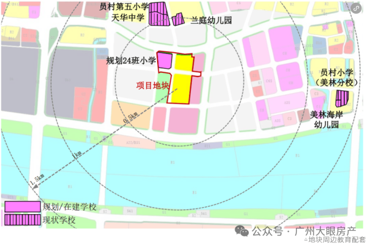 地块1.5公里范围内有员村第五小学、天华中学、兰庭幼儿园、员村小学(美林分校)、美林海岸幼儿园等。