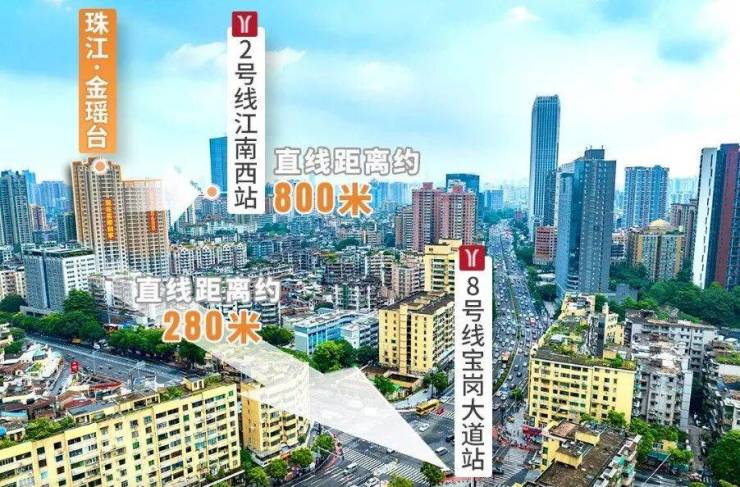 2/8号线双地铁上盖:约280米即达8号线宝岗大道站,20分钟直通达珠江新城;约800米2号线江南西地铁站,可通达广州南站等大型交通枢纽;