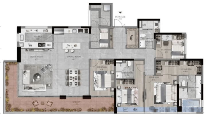 220-225㎡五房两厅三卫为进阶之选,总价1000万起,一梯一户配置,中西厨分离,大面积步入式衣帽间搭配转角飘窗,双面宽阳台兼顾江景与园景,适合多代同堂家庭。