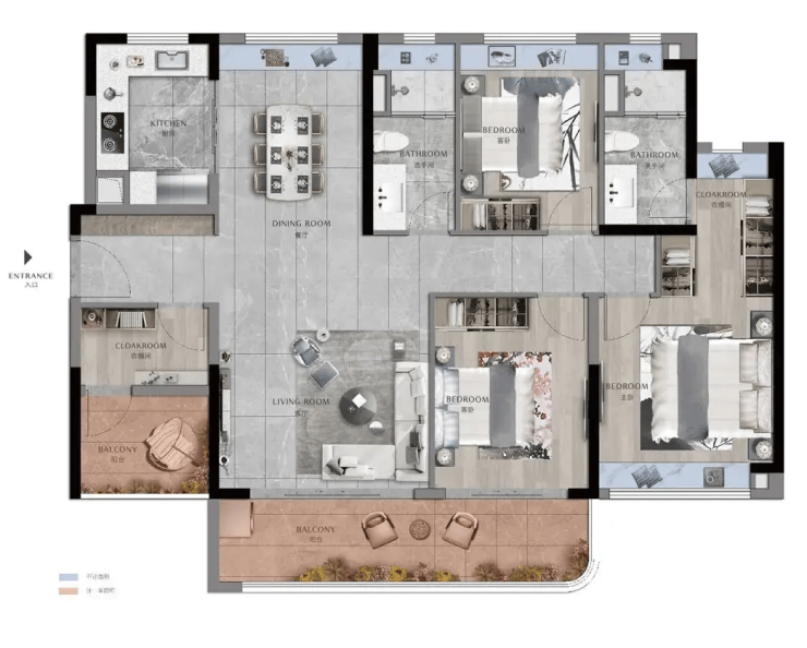 125㎡三房两厅两卫则侧重舒适度,餐客一体南北通透,主卧带独卫与衣帽间,全景飘窗引景入户,适合三口之家改善。