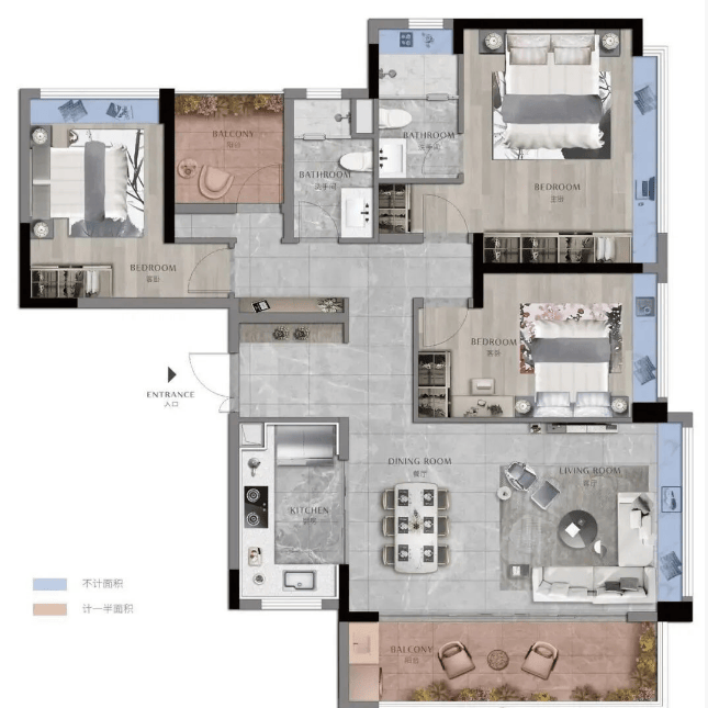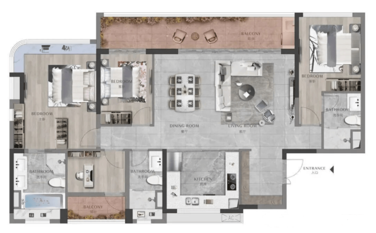 目前在售户型覆盖105-225㎡三至五房,全为精装交付,得房率超85%,适配不同家庭结构。