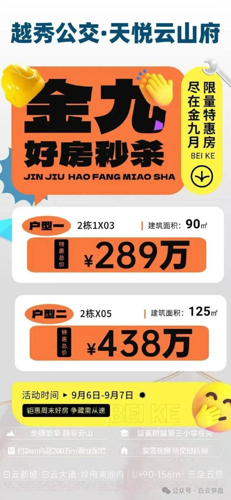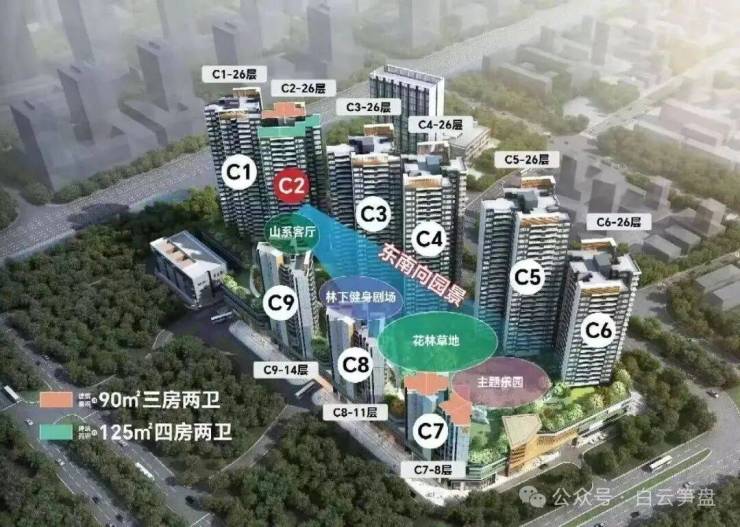 产品方面:目前在售2栋/3栋/4栋/5栋/6栋 90-160㎡平层三至五房,属于大面积/舒适型/白云山景观(改善型)