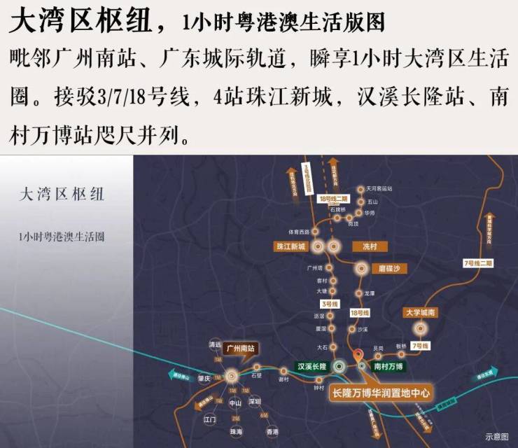 - 地铁:3/7号线汉溪长隆站;18号线南村万博站;湾区城际长隆站,1站珠江新城、2站琶洲