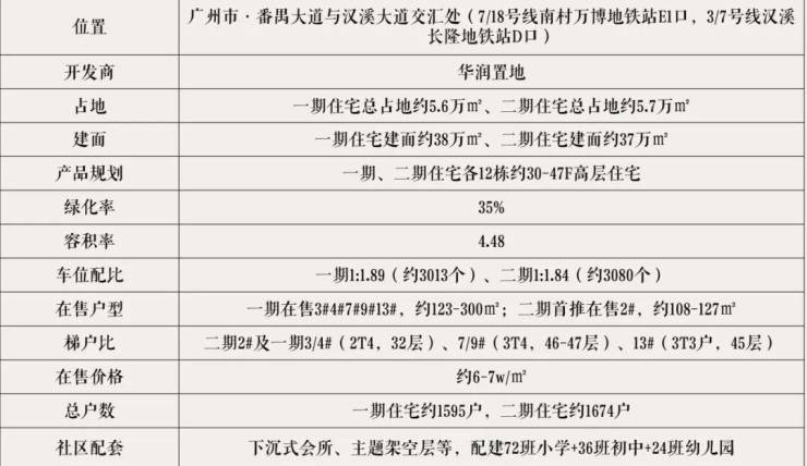 - 规模参数:占地约12万㎡,建面约48万㎡;分三期开发,高层32-47层;容积率4.48,绿化率35%;车位比1:1.5