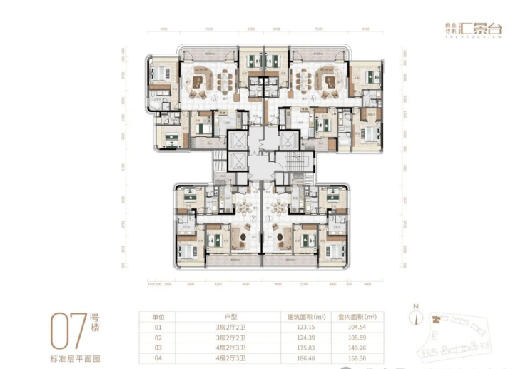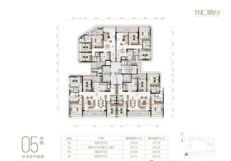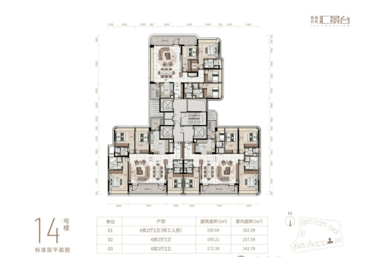 项目由14栋12层小高层组成,产品涵盖123-352㎡三至五房,共8类户型,户型实用率约82-84%