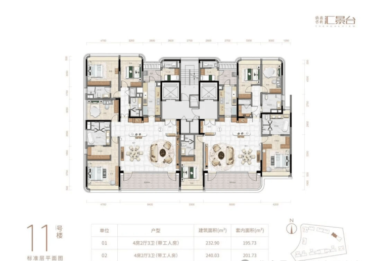 主力户型面积在123-352平方米之间,主打三至五房,户型实用率高达82.8%。部分户型拥有270°极致观景台,并配备了广州首例电动外遮阳系统,让业主在家中就能欣赏到城市的美景。