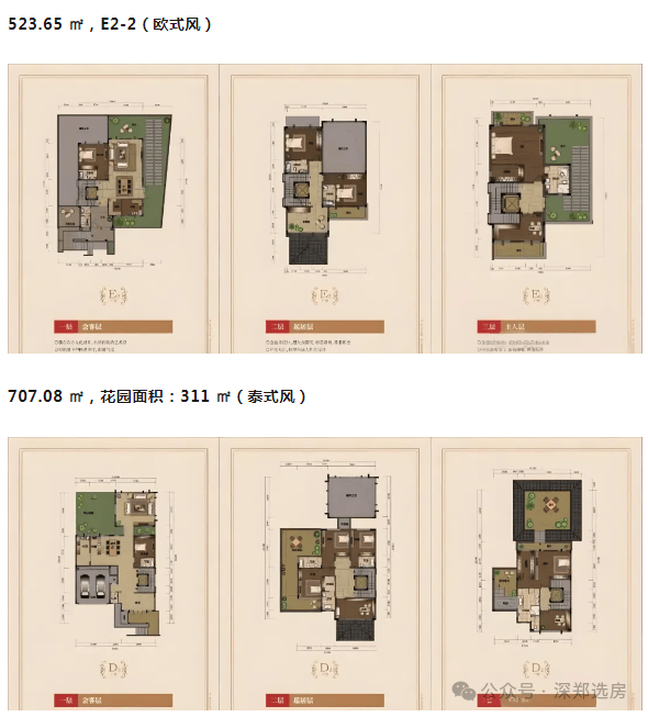 项目共分为两期开发,目前开发期,共有52套别墅,其中42套为独栋别墅,10套为双拼别墅,户型为380-1800㎡(建筑面积)不等,共14种户型。