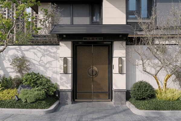 主入口为弧形环抱山门的形式,门楼挑高超4.2m,结合外界面围墙一体化设计,顶部浅金色铝板,花岗岩石材外墙和金属外墙结合,打造具有宋韵雅奢的山门坡屋顶门楼,结合跌瀑水景与点缀景石,营造了归家的礼序感和尊贵感。