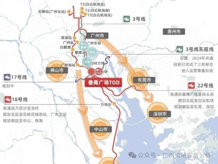 项目距离地铁3号线东延段傍江站直线约500米,步行要900米左右,一站即达番禺广场站。