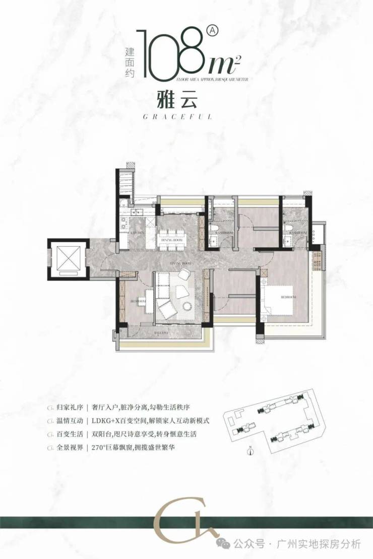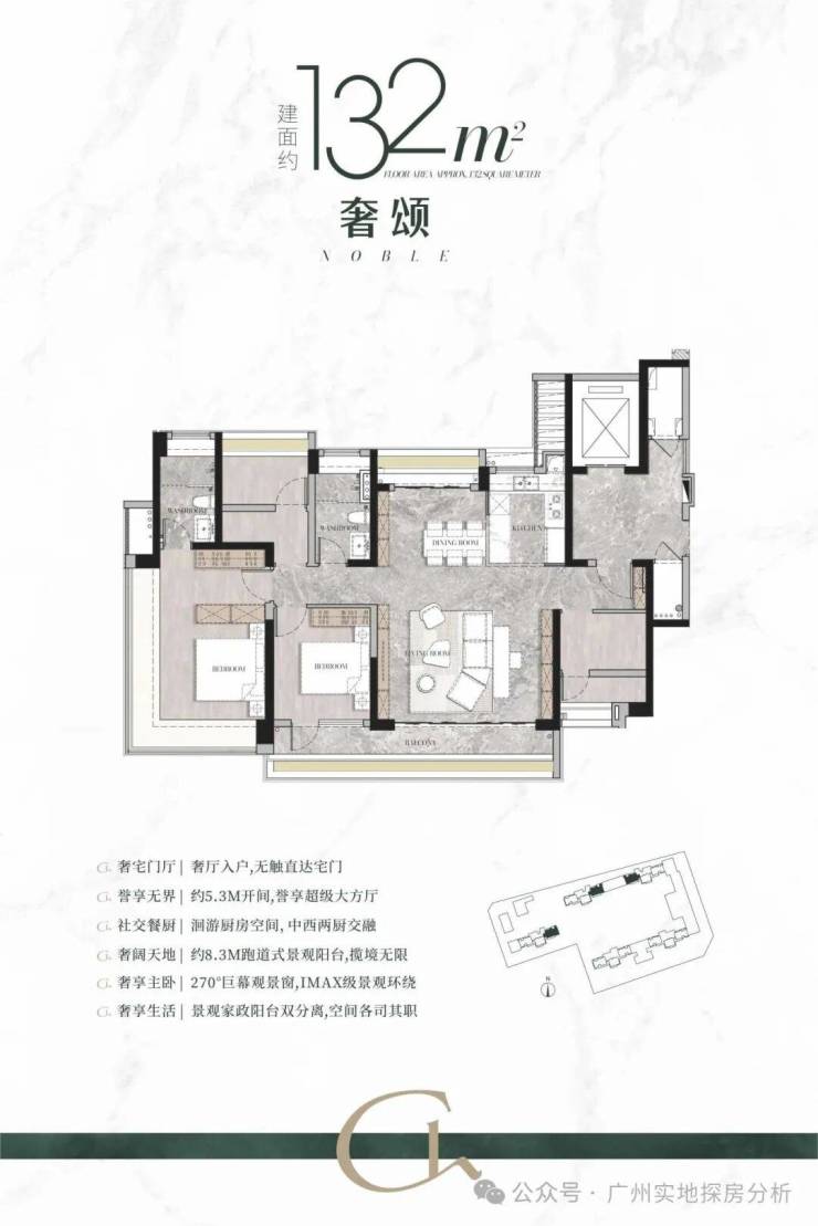 建面132㎡户型,专梯入户,约8.3米跑道型阳台单边位,南北双阳台,LDKG一体化设计,大方厅面宽约5.3米,主卧270度景观飘窗,私密性很好。