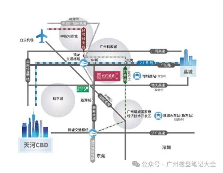【城轨畅联湾区】项目紧邻「镇龙」交通枢纽站,一站到镇龙,站内换乘新白广城际。连通新塘TOD枢纽,快速抵达广州/深圳双机场。