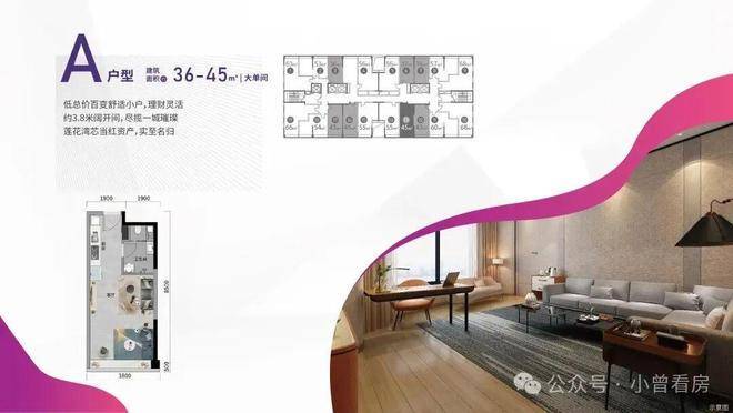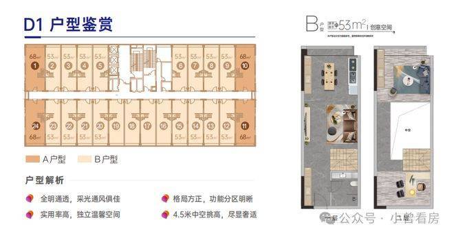 项目提供的产品形态以小面积高利用率公寓为主,主力面积区间为36㎡至68㎡。平层公寓与复式公寓同步供应,满足投资型客户和自住型客户的不同需求。53㎡至68㎡的复式空间设计,采用4.5米挑高结构,使室内空间具备更强的可改造性。高挑高空间在城市公寓产品中具有明显优势,可以通过二层功能划分实现居住与办公分区。