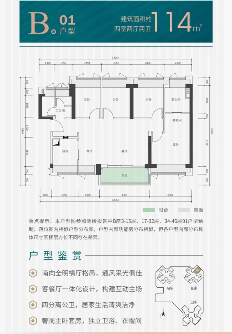 114㎡的4房2厅2卫,设计的是横厅南北通透格局,进门入户玄关,客餐厅实测6米开间,LDKB一体化设计,4个卧室分别做到了主卧15.25㎡/次卧9㎡/次卧8.1㎡/次卧7.9㎡(实测面积,去掉墙体),U型厨房,公卫三段式分离,得房率约76.2%(不含赠送),阳台主朝西南或东南向。套内面积86.92㎡+实测赠送面积14.31㎡,加上赠送得房率88.77%。
