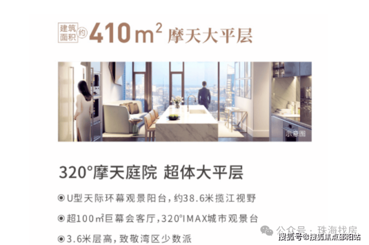 远超现有标准极限的约38.6米U型大阳台,320°摩天庭院、全屋落地窗、约3.6米舒适层高、约120㎡巨幕会客厅等极致的尊崇,刷新城市封面格局。