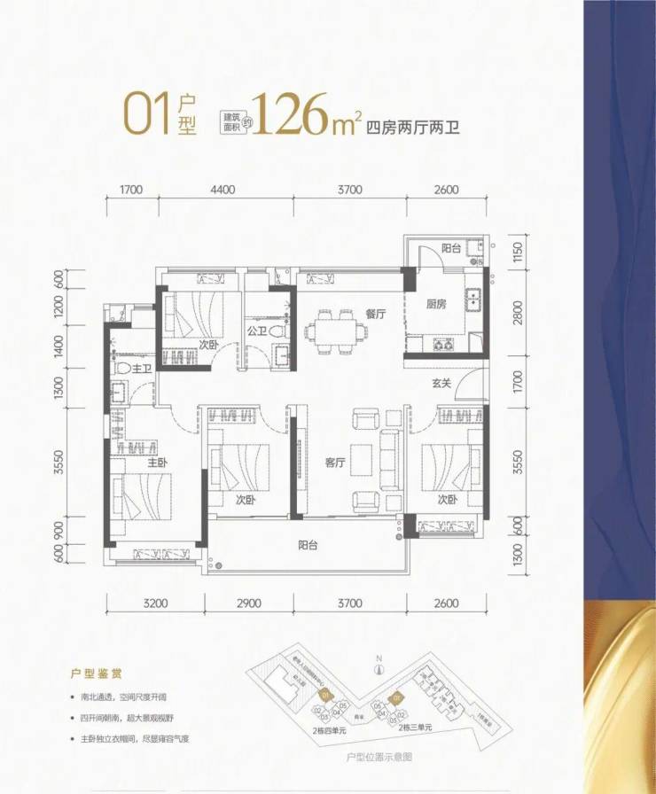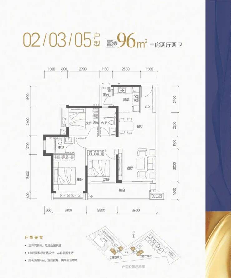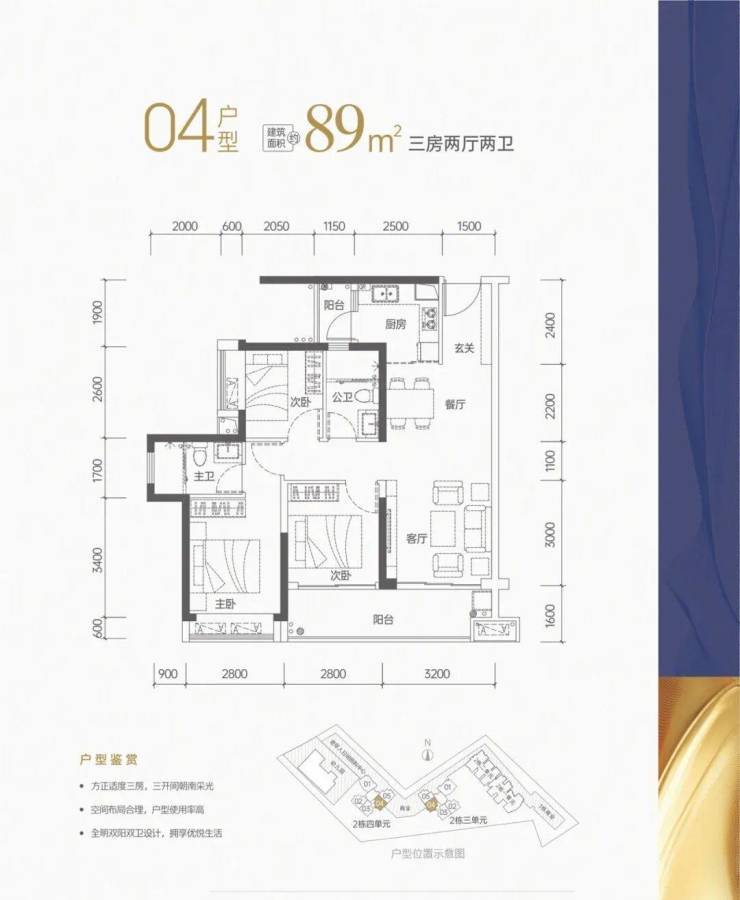 :三开间朝南+6米景观阳台,次卧面宽2.8米