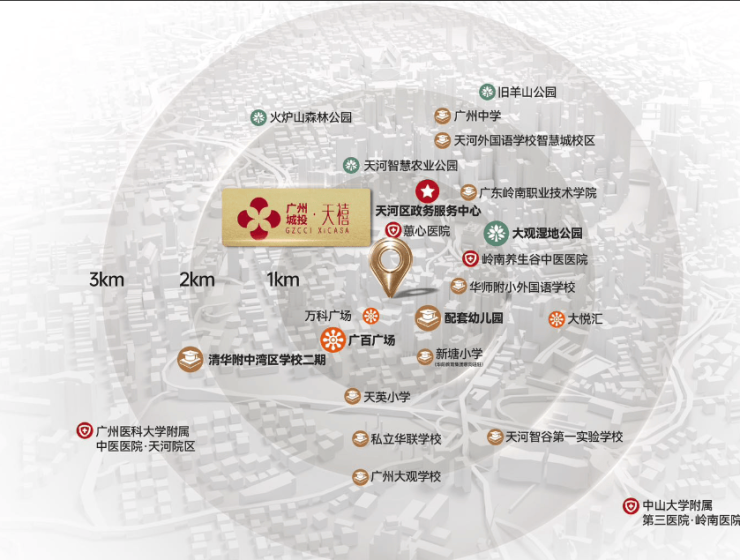 广州医科大学附属中医医院·天河院区(约8km)、中山大学附属第三医院·岭南医院(约8km)等三甲医院环绕周边,为健康保驾护航